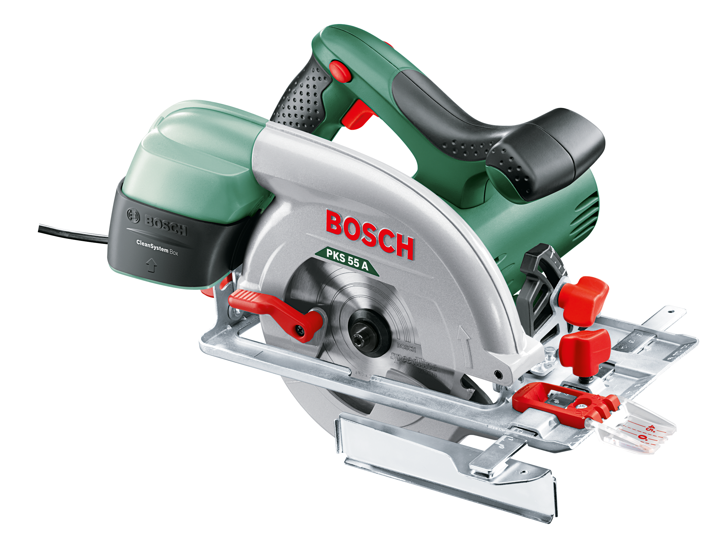 Precizie şi control – beneficiaţi de limitatorul paralel integrat al ferăstrăului circular PKS 55 A pentru rezultate precise de tăiere dreaptă, de-a lungul liniei de tăiere. Reglaţi adâncimea şi unghiul de tăiere în funcţie de necesităţile fiecărei lucrări cu ajutorul pârghiilor de strângere integrate. CutControl asigură orientarea permiţând tăieri exacte de-a lungul liniilor trasate. Este conceput pentru tăieri drepte în lemn. Blocarea arborelui ferăstrăului permite schimbarea pânzelor de ferăstrău. CleanSystem Box colectează aşchiile în timpul tăierii pentru un spaţiu de lucru curat. De asemenea, talpa de fixare este prevăzută cu o canelură în care poate intra şina de ghidare.