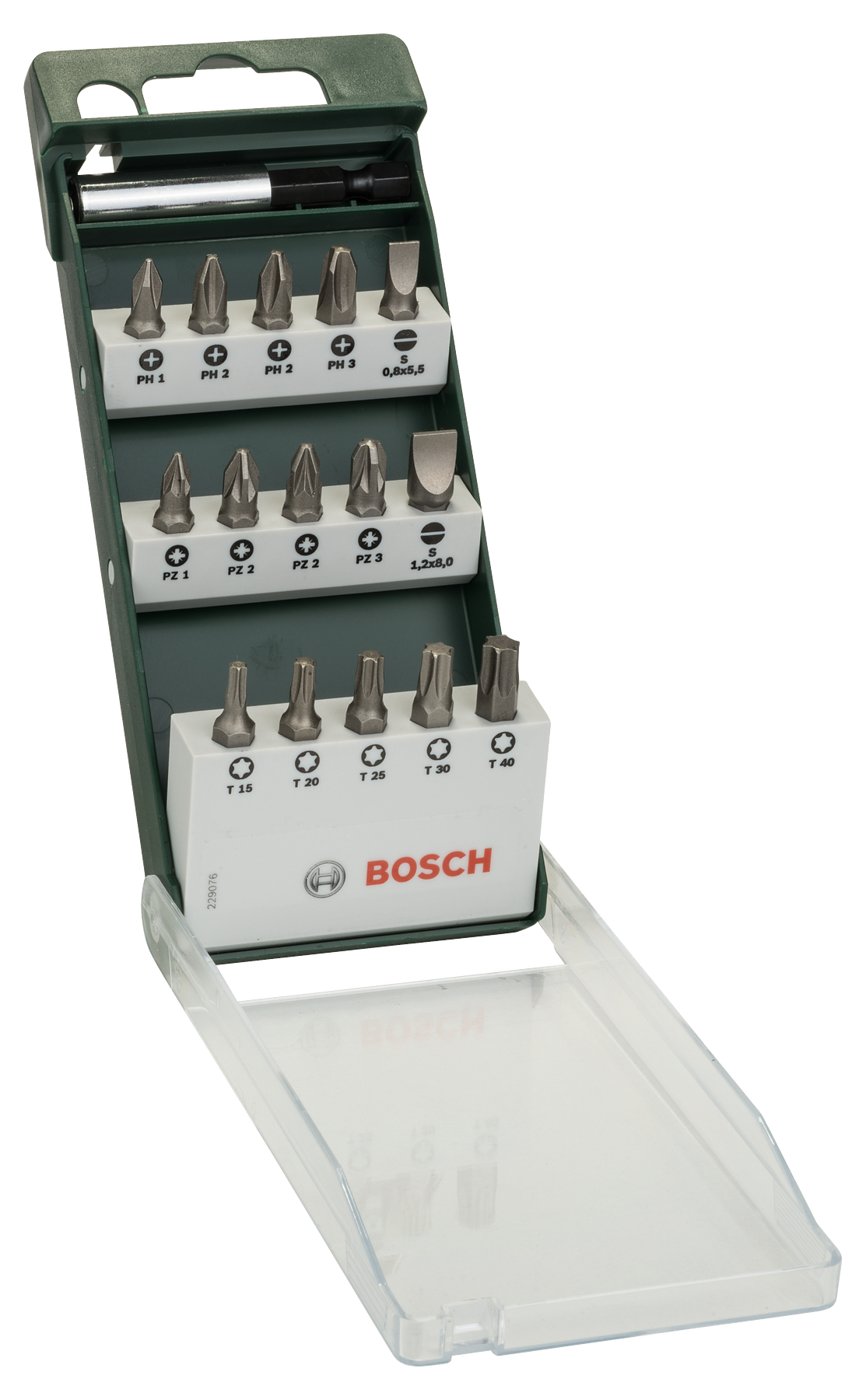 • Cu suport universal și 15 capete de inserție pentru șuruburi Philipps, Pozidriv®, Torx® și șuruburi cu cap crestat